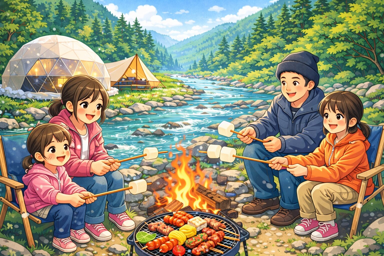 雪がちらつくなかで思った以上に寒かったけれど、テントのすぐ横でBBQできるので、寒くなったらテント(エアコン付きでぬくぬく)に避難しながら食べました。