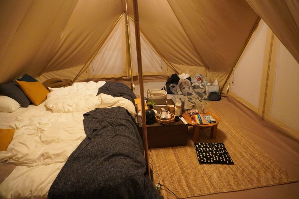 テントの中にはダブルのベッドが2台置かれ、これがふかふかなんです。